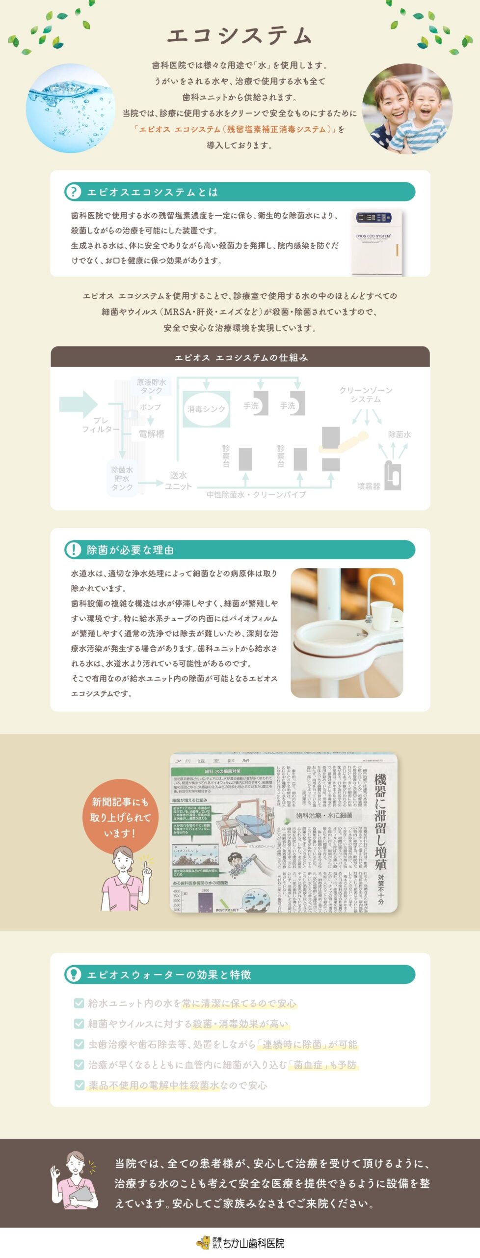 当院では、診療に使用する水をクリーンで安全なものにするために「エピオス エコシステム(残留塩素補正消毒システム)」を導入しております。